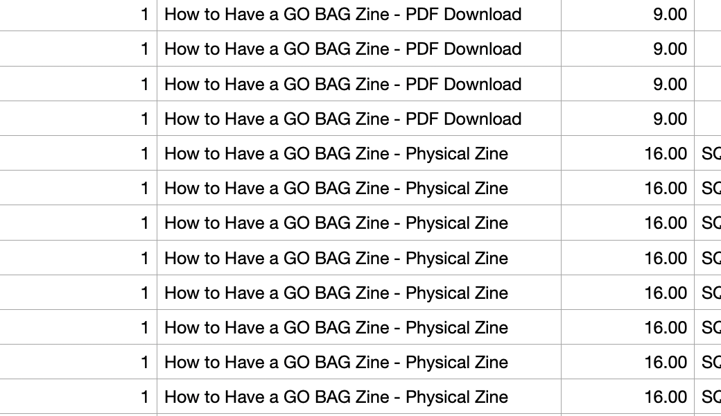 As promised, I want to share numbers and receipts around Go Bag Zine Purchases and the donations I have made to go along with them. I am really happy with the slow, sustainable roll-in of orders and have so much gratitude for every single person who has purchased a zine, digital or physical. If you still want one, I made another batch of physical Zines, and PDFs are instant downloads.