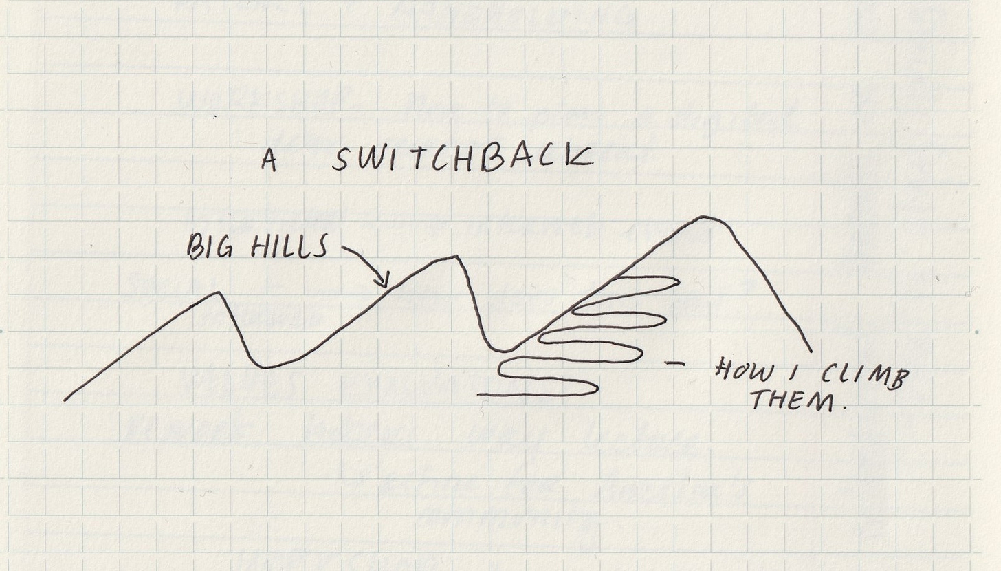 That is the key to the switchback, accessibility. How can we arrive at our destination of being more creative in a way that is compassionate to our bodies and minds? Can we build a connection to our creative practice, without layering on gobs of shame inherited from productivity advice and neurotypical habit systems?
